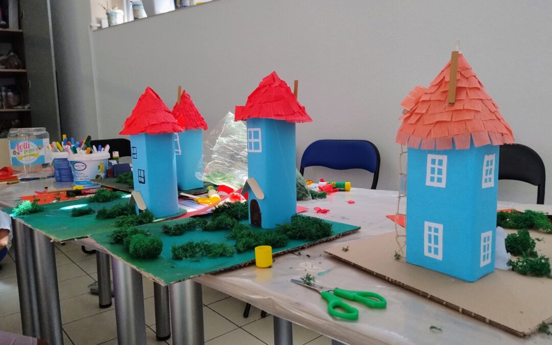 Pierwsze tegoroczne zajęcia wakacyjne w bibliotece  już za nami … tym razem z okazji 80-lecia Muminków zbudowaliśmy  okrągłe, niebieskie  domki z białymi oknami pokryte czerwoną dachówką. Brzmi znajomo? Tak!!! Każdy kto pokochał Muminki dobrze wie, że tak wygląda ich domek. Dzieci nie tylko zbudowały domki, ale stworzyły wokół nich mały świat pełen ulubionych postaci.